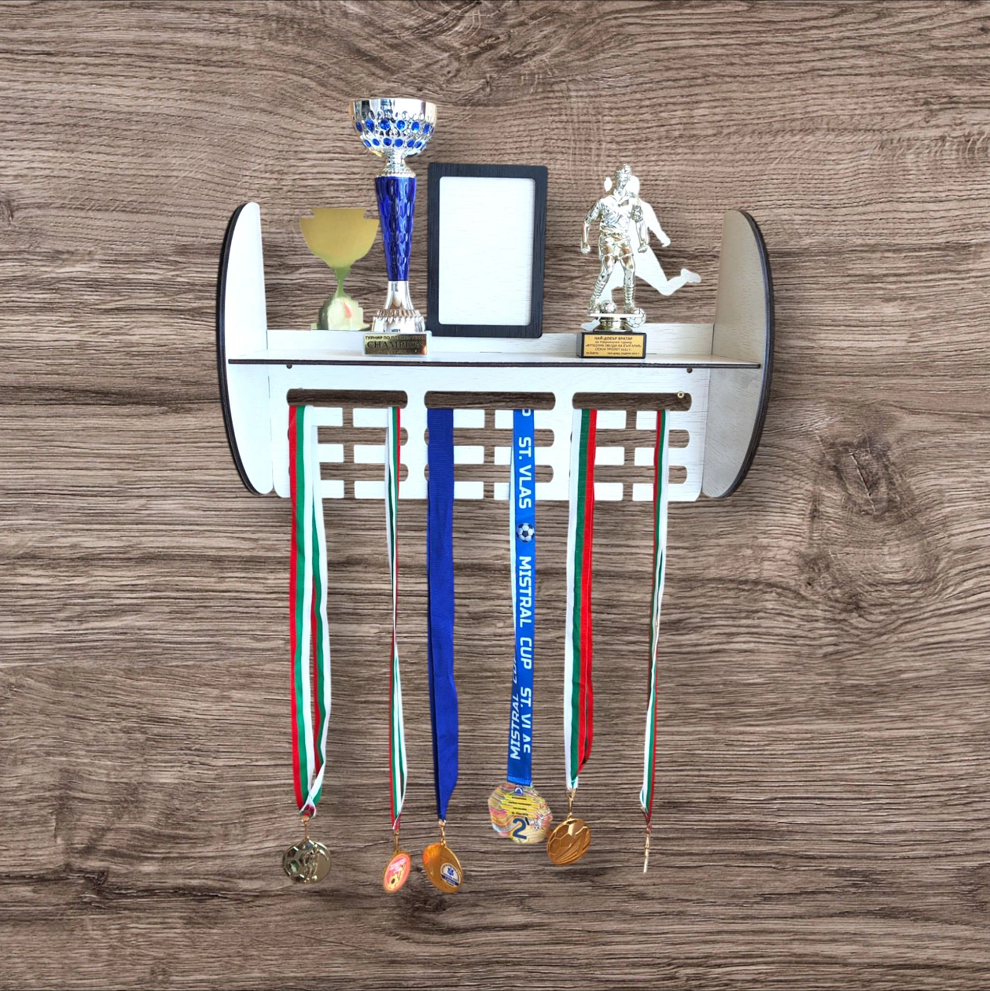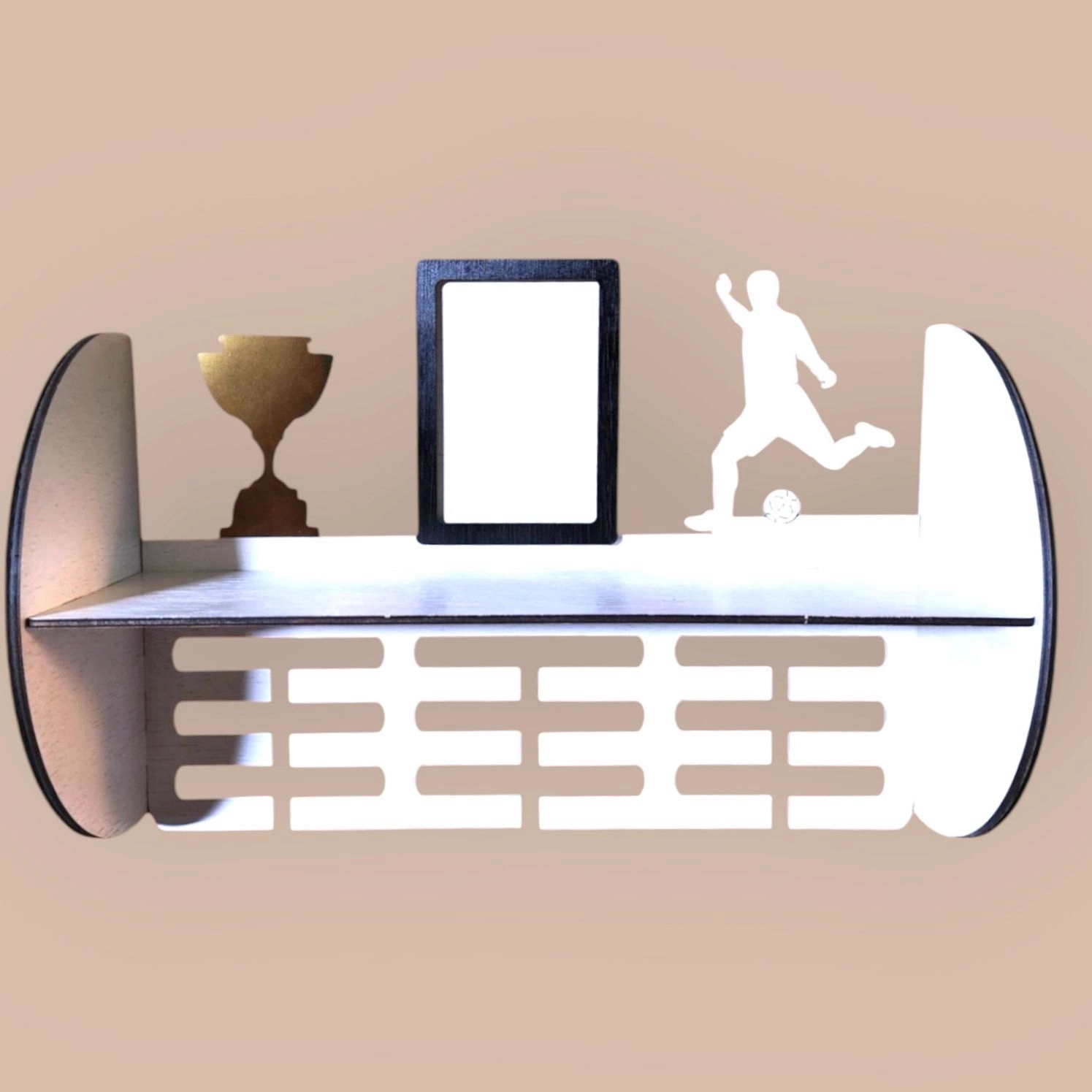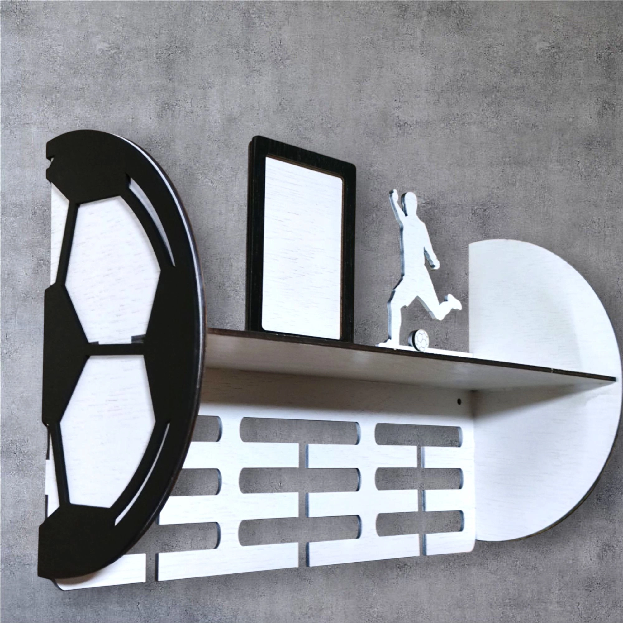 Покажи постиженията си с дървената закачалка за медали с рафт и рамка за снимка на футболна тематика.